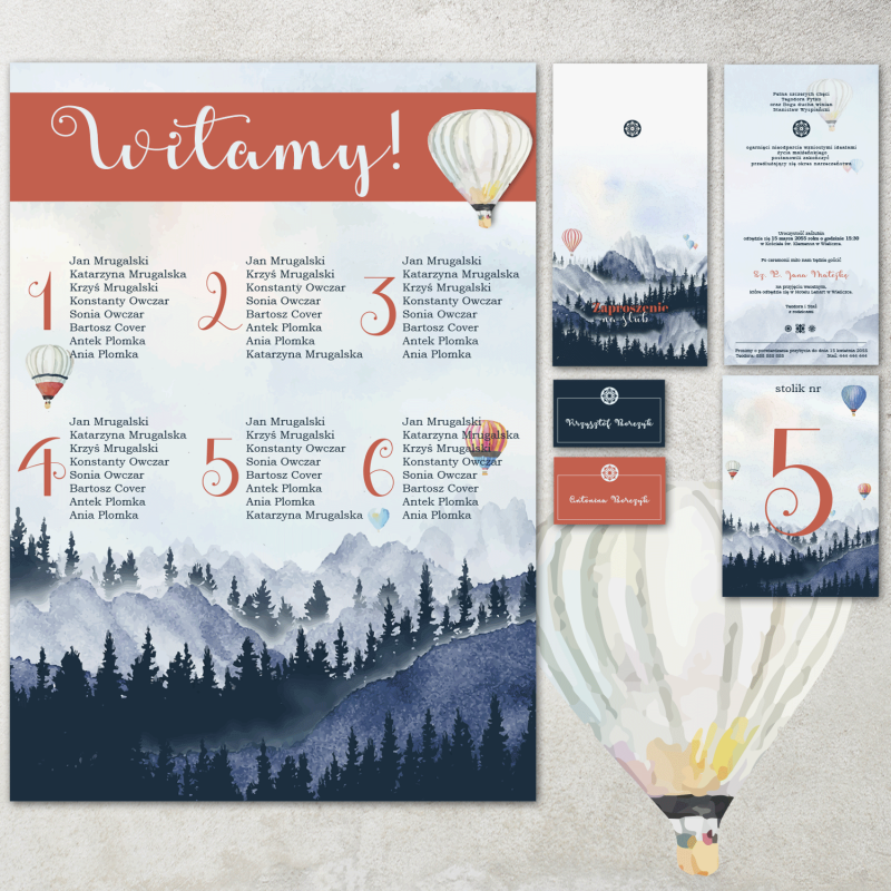 W tej samej stylistyce polecamy również: winietki, zaproszenia, oraz numerki na stoły. Możemy także dostoswoać projekt do innych realizacji które Państwa interesują.