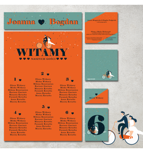 W tej samej stylistyce polecamy również: zaproszenia, tablicę z rozmieszczeniem stołów, oraz winietki. Możemy także dostoswoać projekt do innych realizacji które Państwa interesują.