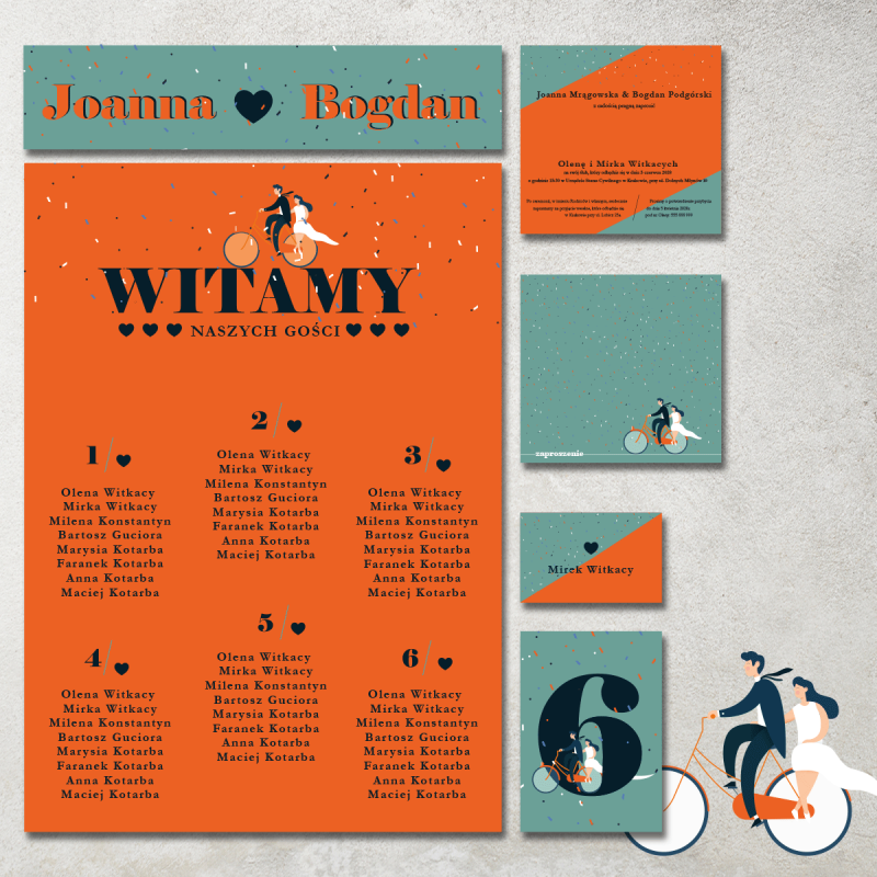 W tej samej stylistyce polecamy również: zaproszenia, tablicę z rozmieszczeniem stołów, oraz numerki na stoły. Możemy także dostoswoać projekt do innych realizacji które Państwa interesują.