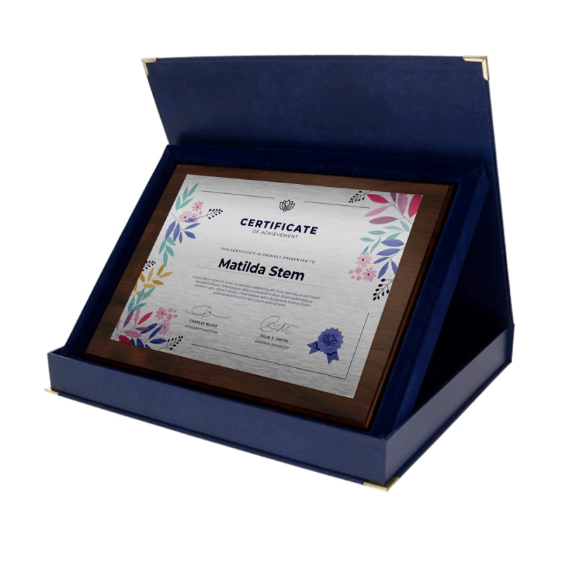Elegancki podkład z w kolorze brązowym dedykowany do blach aluminiowych może zostać powieszony na ścianie (każdy podkład posiada z tylu odpowiednie otwory) lub być zaprezentowany w eleganckim etui. Idealne rozwiązanie do produkcji oryginalnych nagród, podziękowań, pamiątek itp.