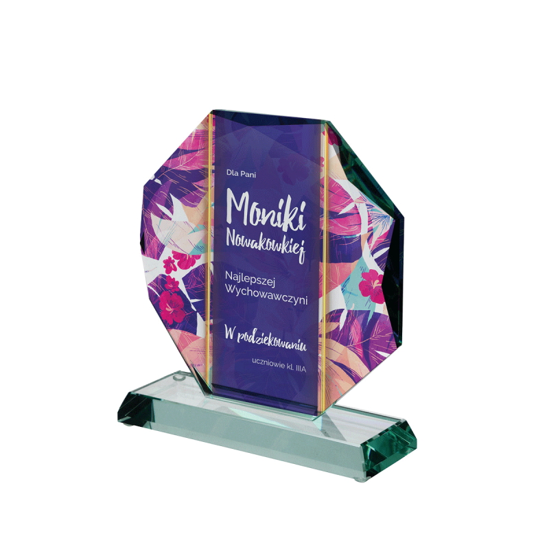 Statuetka szklana z nadrukiem kolorowym i ekeftem 3D,
